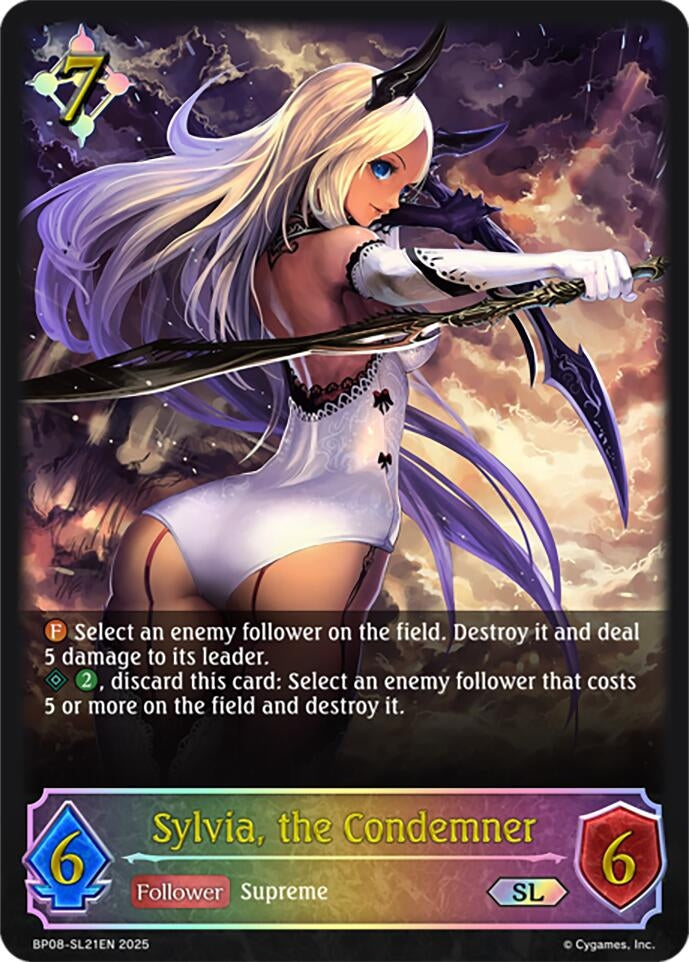 Description: | [Fanfare] Select an enemy follower on the field. Destroy it and deal 5 damage to its leader. [Act] [2], discard this card: Select an enemy follower that costs 5 or more on the field and destroy it. |